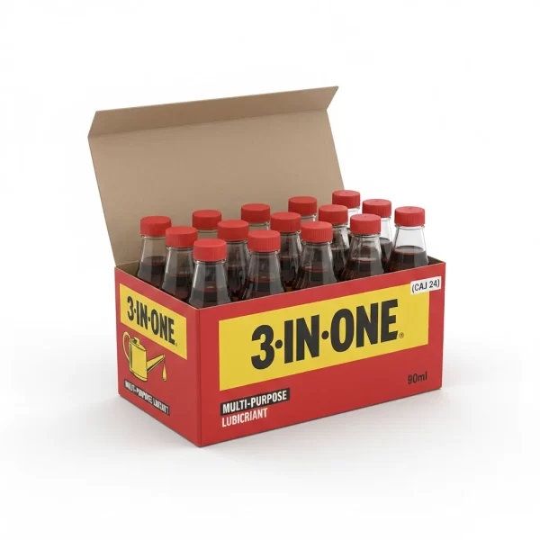 El Aceite Lubricante Multiusos 3 En 1 de 90ml, disponible en caja de 24 unidades, es la solución perfecta para lubricar, limpiar y proteger todo lo que necesites.