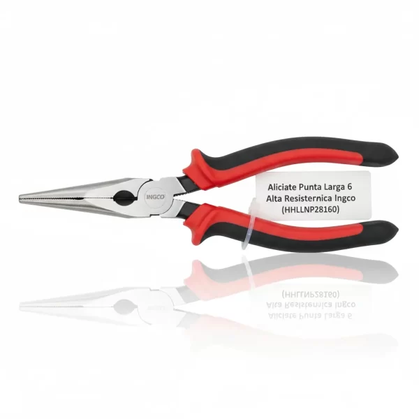 El Alicate Punta Larga 6 Alta Resistencia (hhlnp28160) de Ingco es una herramienta Cr-V de alto rendimiento, diseñada para ahorrar un 30% de esfuerzo, ideal para trabajos de precisión y agarre.