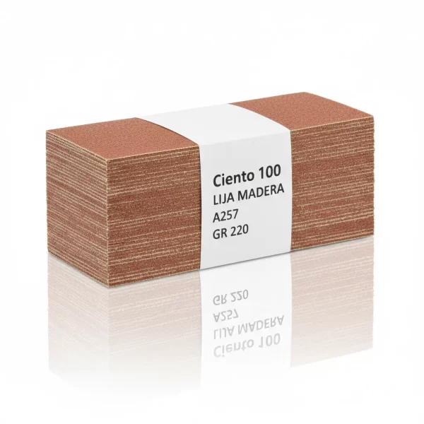 La caja de “Ciento Lija Madera A257 Gr 220” de Norton contiene 100 hojas de papel de lija de grano 220, ideal para el lijado fino de madera, masilla y yeso, proporcionando un excelente acabado en proyectos de construcción o reparación.