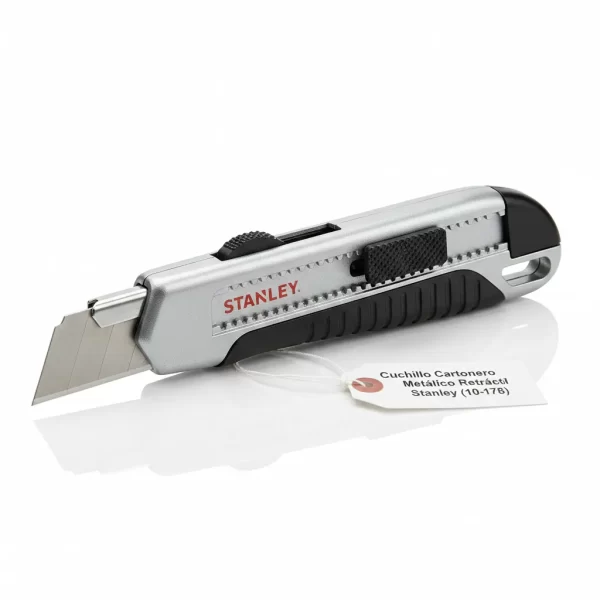El Cuchillo Cartonero Metálico Retráctil (10175) Stanley es una herramienta robusta y segura, ideal para tareas de corte precisas en cartón y otros materiales, ofreciendo durabilidad y fácil manejo.