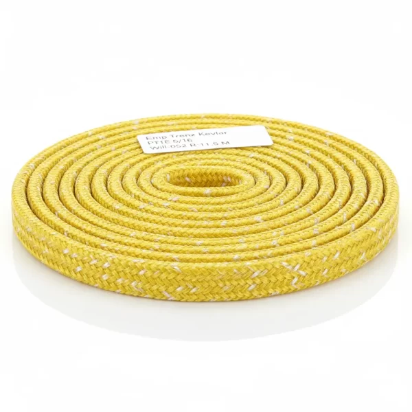 La empaquetadura trenzada de Kevlar y PTFE, modelo 5/16 Will-052 con una resistencia de 11.5 metros, es ideal para aplicaciones que requieren alta durabilidad y sellado eficaz.