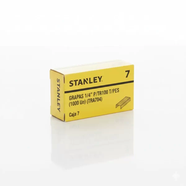 Las grapas 1/4 para TR100 de trabajo pesado, presentadas en una caja de 7 que contiene 1000 unidades (modelo TRA704), son esenciales para asegurar tus materiales con máxima firmeza.