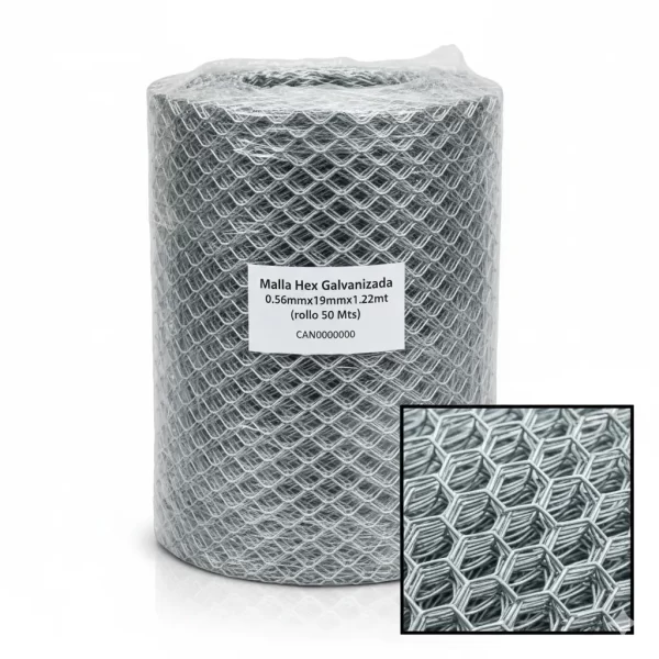 La Malla Hex Galvanizada, con sus especificaciones de 0.56mmx19mmx1.22mt, se ofrece en un práctico rollo de 50 metros, ideal para proyectos de cercado y protección que requieren durabilidad y resistencia a la corrosión.