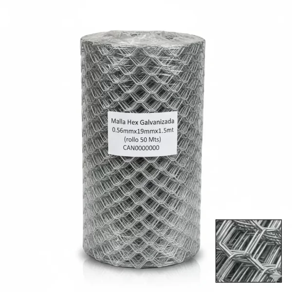 La Malla Hex Galvanizada, con sus especificaciones de 0.56mmx19mmx1.5mt, se presenta en un práctico rollo de 50 metros, ideal para asegurar perímetros con una solución resistente y duradera.