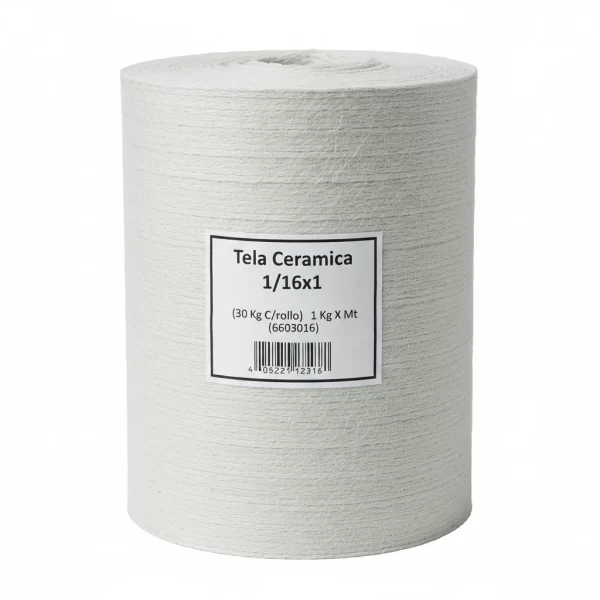 La Tela Cerámica 1/16×1 (código 6603016) se vende en rollos de 30 kg, ofreciendo un rendimiento de 1 kg por metro. Es ideal para aplicaciones que requieren resistencia a altas temperaturas.