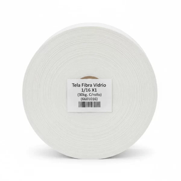 La Tela Fibra Vidrio 1/16 X1, identificada con el código 6601016, es un material resistente que viene en rollos de 30 kg.