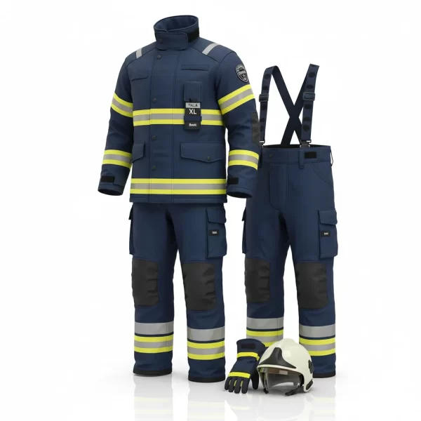 Este es el Traje Bombero Basic En469, en un distintivo color azul y talla XL, diseñado para ofrecer protección esencial.